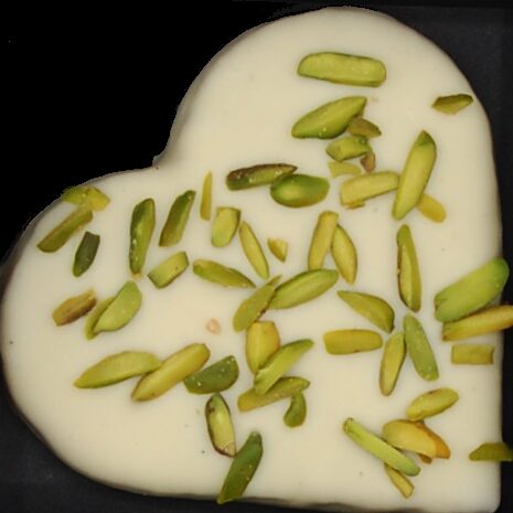 Sous sa coque de chocolat blanc fondant, ce coeur révèle un cœur délicat à la pistache, onctueux et subtilement toasté, relevé par l’éclat acidulé des airelles. Un contraste élégant où la douceur ronde de la pistache rencontre la fraîcheur légèrement fruitée des baies, pour une bouchée à la fois douce et vive.